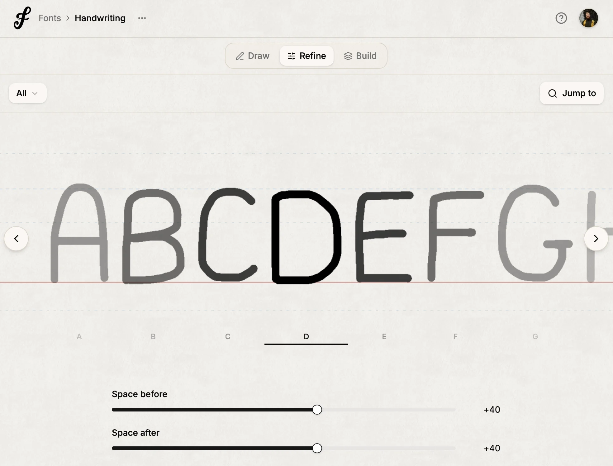 Once your letters are drawn, you might notice some look too close together or too far apart. The Refine step lets you tweak the spacing with simple sliders—no guesswork. You'll see your changes update in real time.