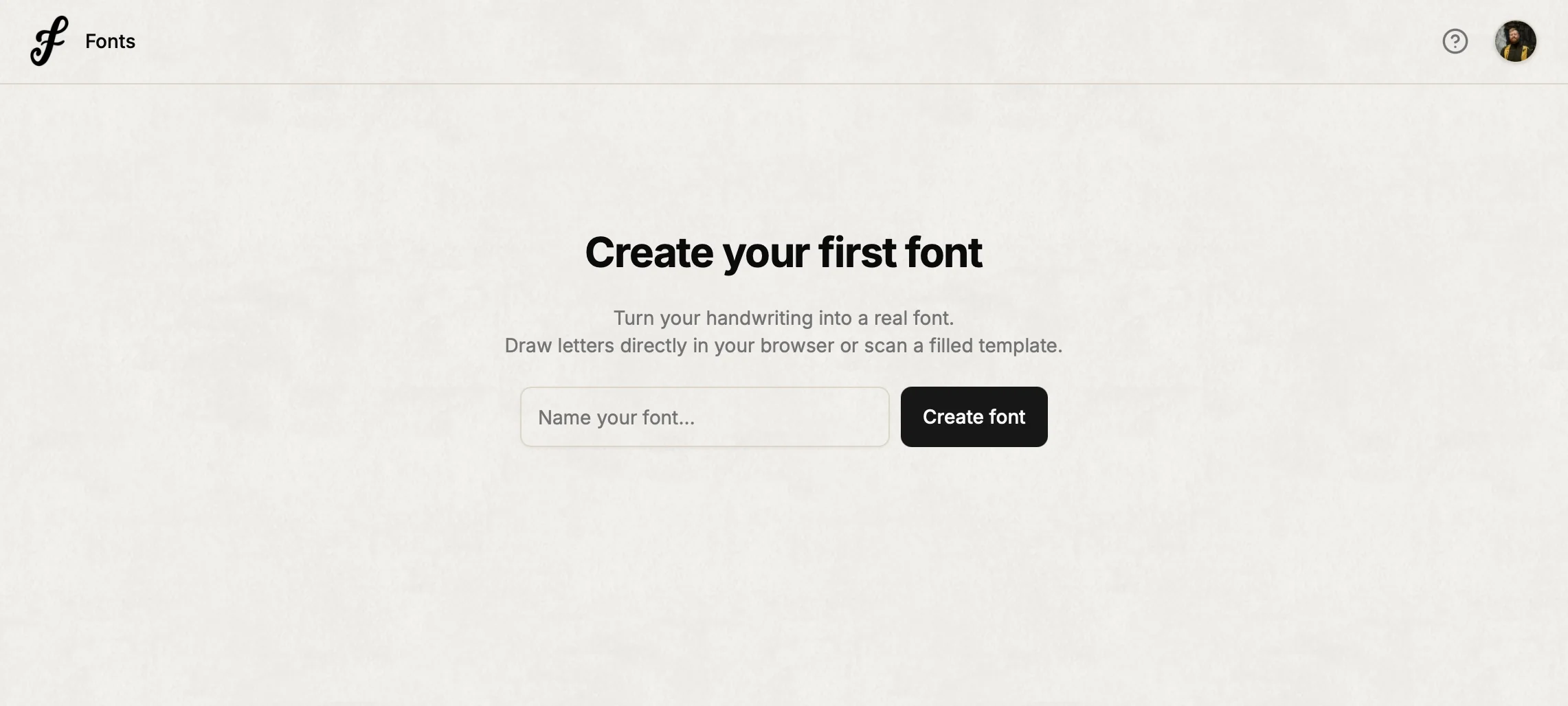 New here? You'll see a simple prompt to create your first font. Type a name (like "My Handwriting" or "Coffee Shop Script") and tap Create font. FontCraft takes you straight to the drawing page.